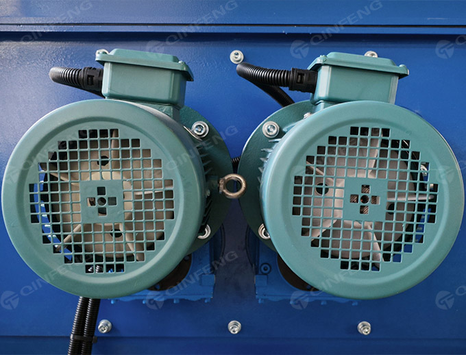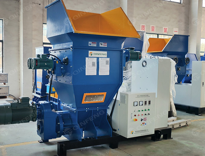 CF-NHM400型号的热熔机采用四轴破碎刀片、双排平行的刀片轴对称地固定在刀片上,刀片在双轴刀片轴上错位排列,各轴上的刀片通过计算的方法均匀地布置在同一方向。每一轴上的第一个刀片和最后一个刀片都成90度角。当双轴破碎刀片开始工作时,两个平行的刀片轴以不同的旋转方向进行旋转,形成一个波浪的控制,这样材料就可以恒定的速度向下移动,在经过切割刀片的切割后,会变成更小的块状。EPS热熔机里的四轴破碎刀片可以把EPS料变成更小体积的块,然后通过滤网。这些不能通过滤网再次被破碎的料会最终通过滤网过滤掉。该材料将由高速旋转螺杆推送到加热筒。主机的螺杆可以输送、加热料,使其达到热熔状态,然后挤出并通过模具冷却得到规则型的方块,更加便于贮存和运输。
